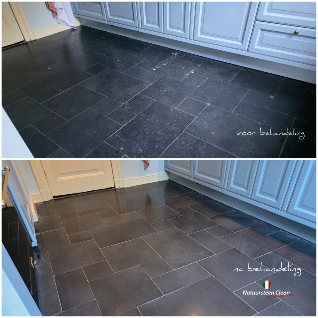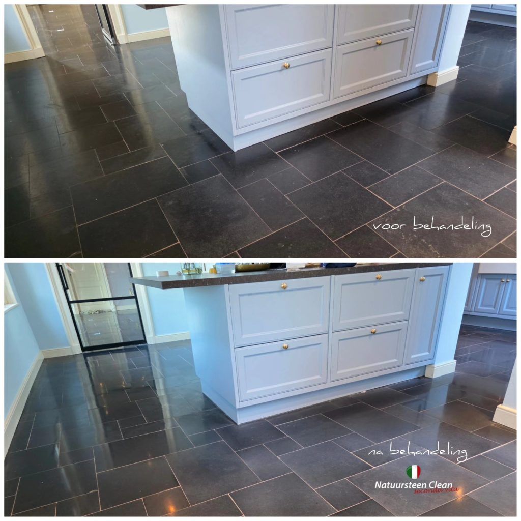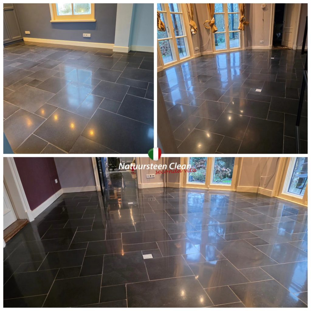 Na het polijsten kwam de structuur en kleur van de steen volledig terug, en dankzij het impregneren is de vloer nu beter beschermd tegen vocht, vuil en vlekken.