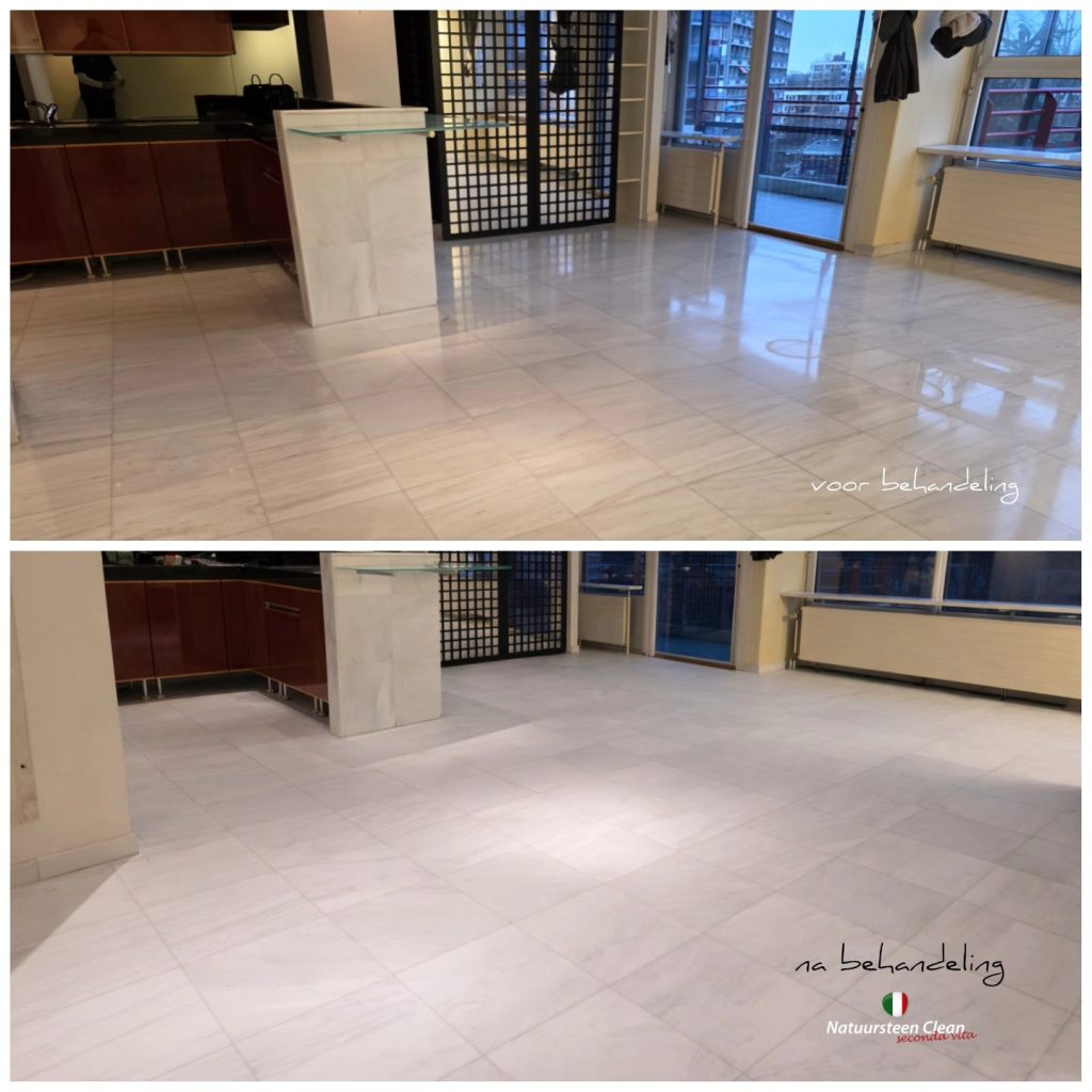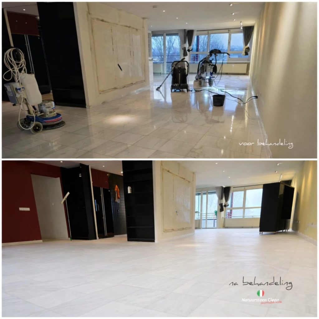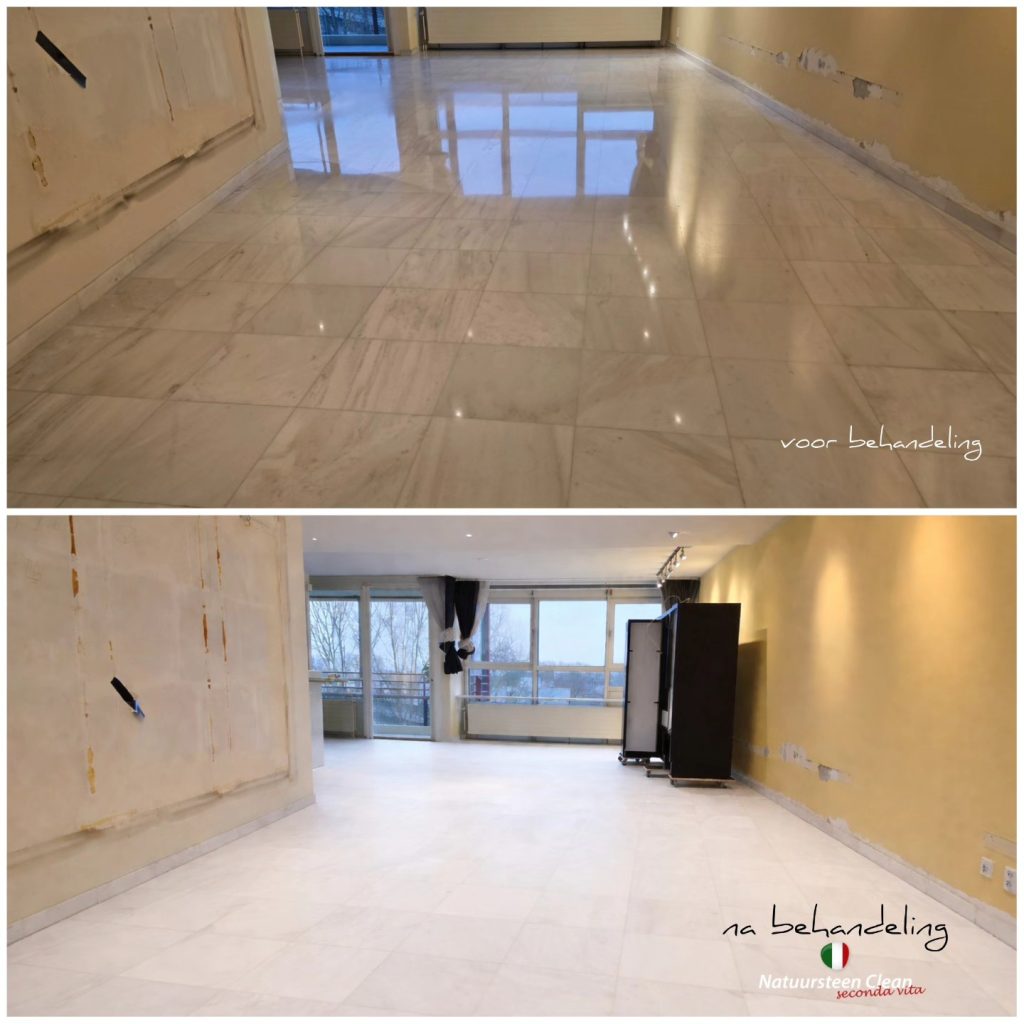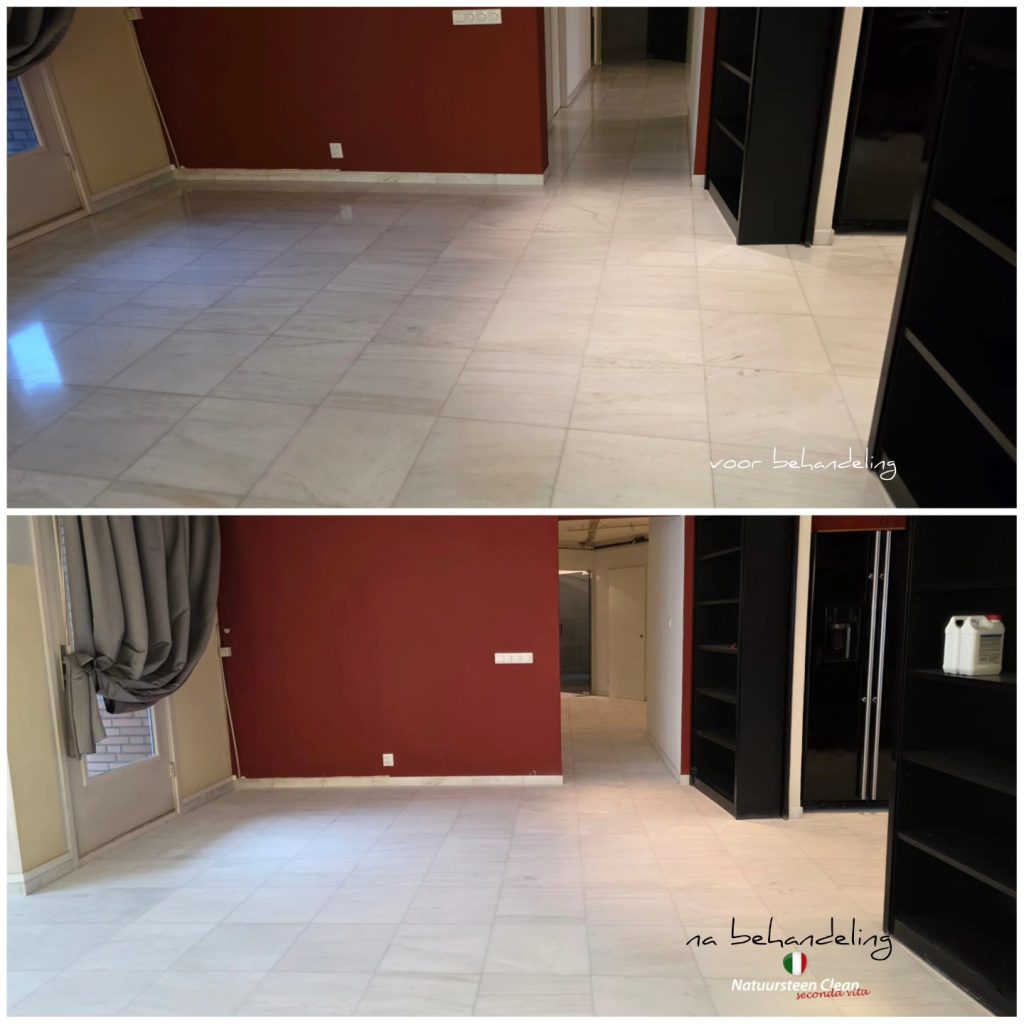 Op deze locatie mochten wij een Rose Aurora marmeren vloer volledig transformeren — van klassiek glanzend naar modern, strak en eigentijds.