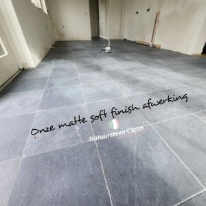 Onlangs hebben we een prachtig project afgerond waarbij we een antique bleu hardstenen vloer in een keuken hebben getransformeerd met onze eigen matte soft finish